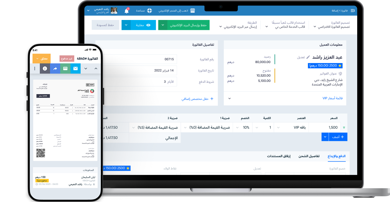 يُمكّنك دفترة من إصدار فواتير إلكترونية متوافقة بالكامل تحتوي على جميع التفاصيل الضريبية والمعاملات المطلوبة وفق تشريعات ضريبة القيمة المضافة في الإمارات.