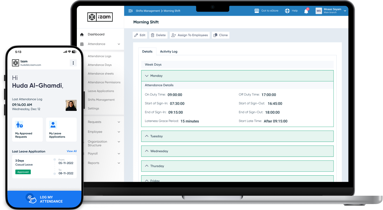 Define basic or advanced shifts by specifying workdays, off days, and daily working hours. Set rules for delays, grace periods, and clock-in/out time windows.
