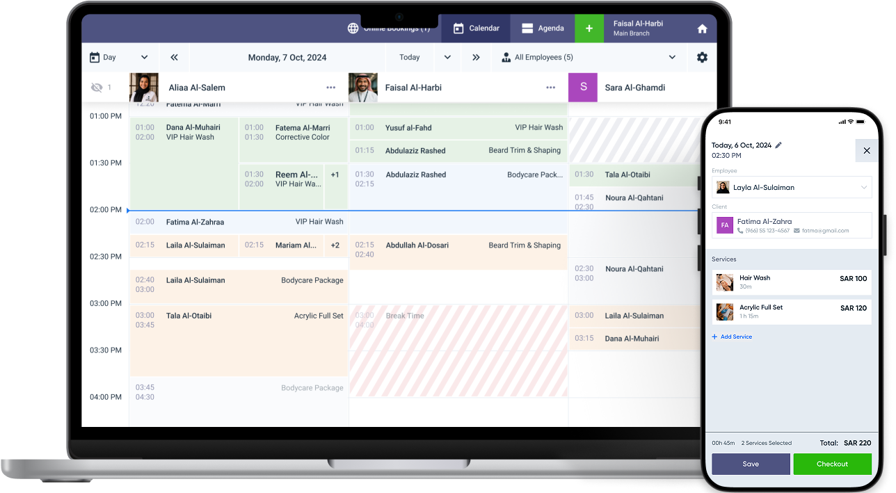 Set the fees of each service and the time spent, the system saves and auto-fills the information and prevents duplication or overlapping of bookings between customers for the same staff.