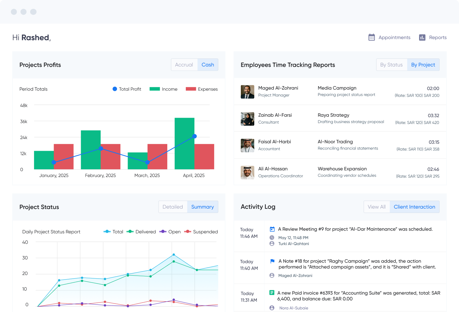 Daftra Operations Management Software is an integrated workflow management solution built around and for SMEs to streamline work orders, projects, practices, services, rentals, bookings, manufacturing, client appointments, employees timesheets and more in one place.
