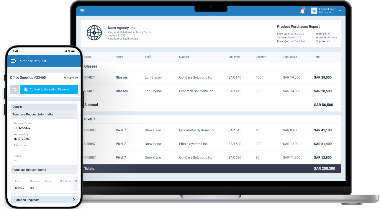 Daftra Purchases Management Software enables you to optimize purchase order management cycle. Track stock levels and follow payments to suppliers. Generate aacurate quotes readily convertible into payable invoices to suppliers. Get detailed reports on stocktaking, purchases, and payment statuses.