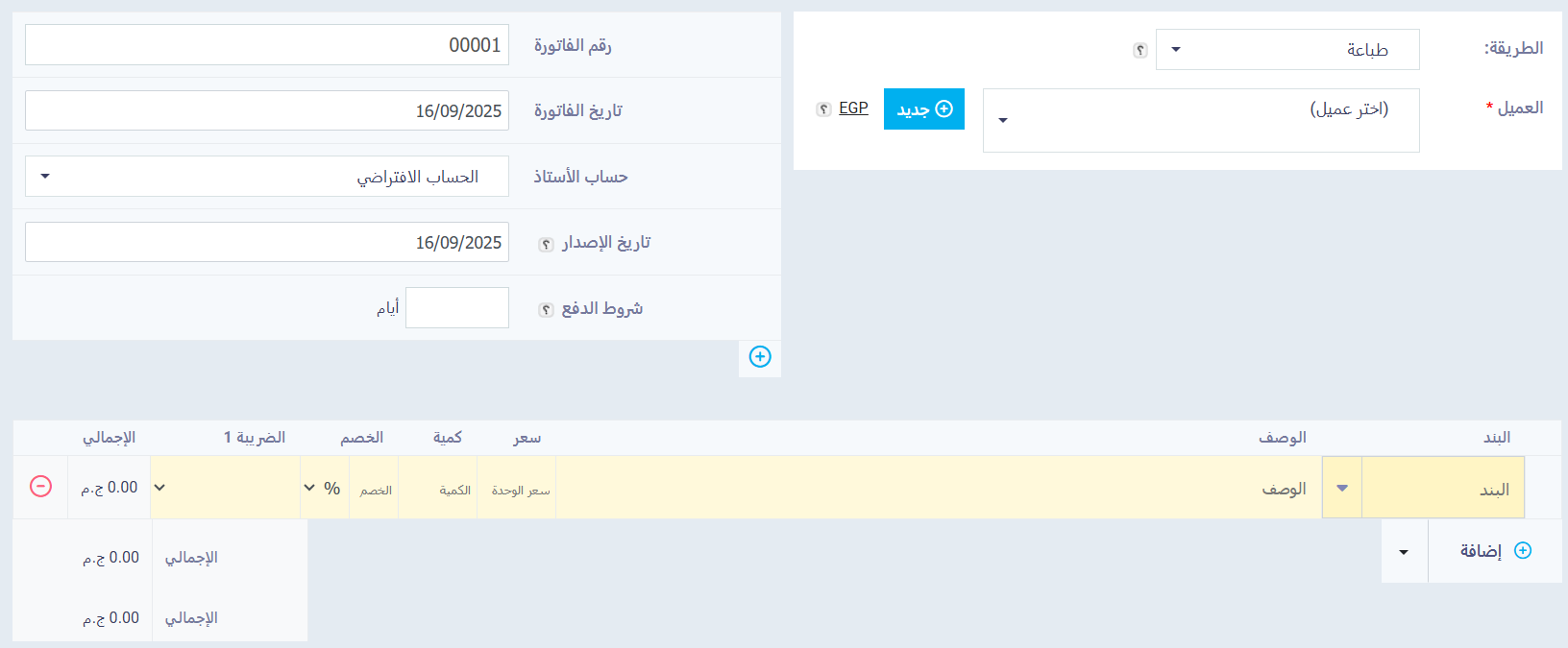 3- إدخال بيانات الفاتورة الأساسية: اسم العميل، المنتج أو الخدمة، السعر.