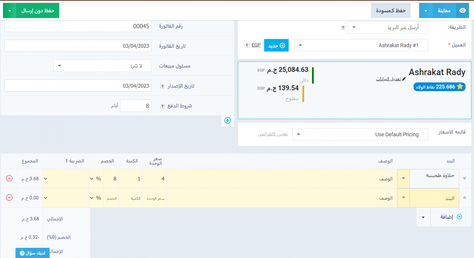 - خصم على إجمالي الفاتورة: أضف خصمًا على المبلغ الإجمالي بنفس الطريقة (نسبة أو مبلغ ثابت).