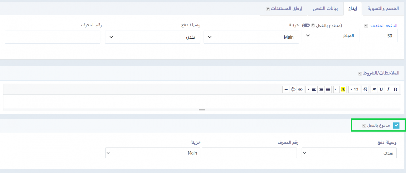 - الدفع الكامل: إذا تم دفع الفاتورة بالكامل، فعّل خيار "مدفوع بالفعل" وحدد وسيلة الدفع (مثل التحويل البنكي أو الشيك) والخزينة.