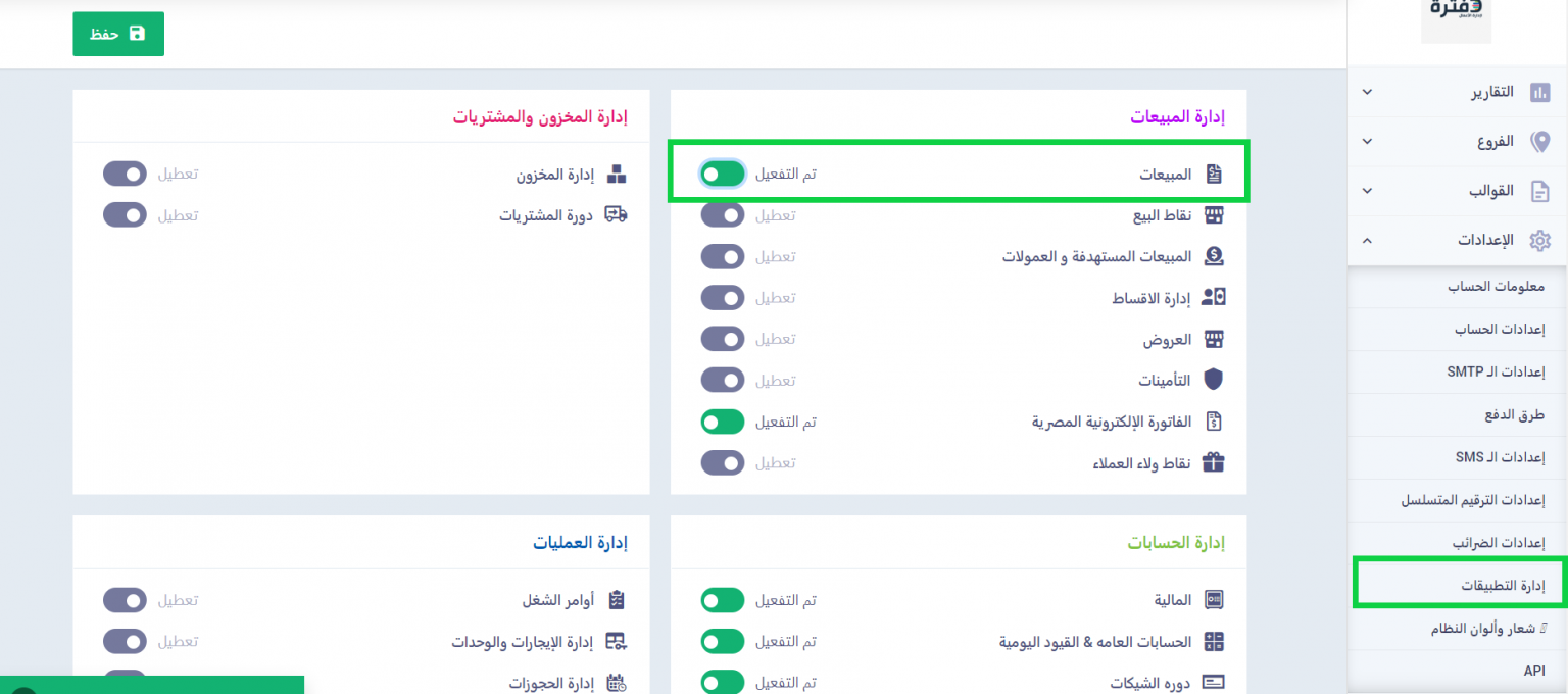 قبل البدء في إنشاء الفاتورة، تأكد من تفعيل تطبيق المبيعات في حسابك على دفترة: