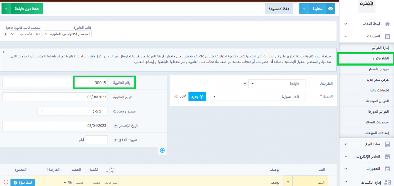 - سيقوم النظام تلقائيًا بإنشاء فاتورة جديدة تحمل رقمًا تسلسليًا فريدًا.