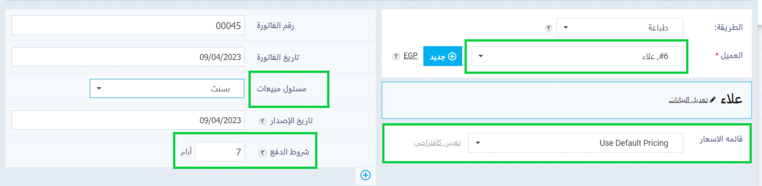 - مسئول المبيعات: إذا كنت تدير فريق مبيعات، يمكنك تعيين الفاتورة لبائع معين. هذا يساعد في تتبع الأداء وتوزيع العمولات لاحقًا.